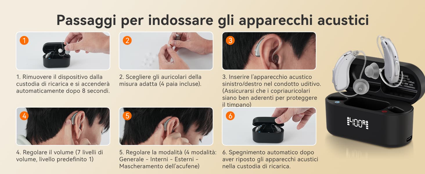 ① Una breve pressione del pulsante su aumenta il volume dell'apparecchio acustico senza prescrizione medica, accompagnato da un "bip" a ogni breve pressione. Il volume massimo è indicato da tre "bip bip bip".